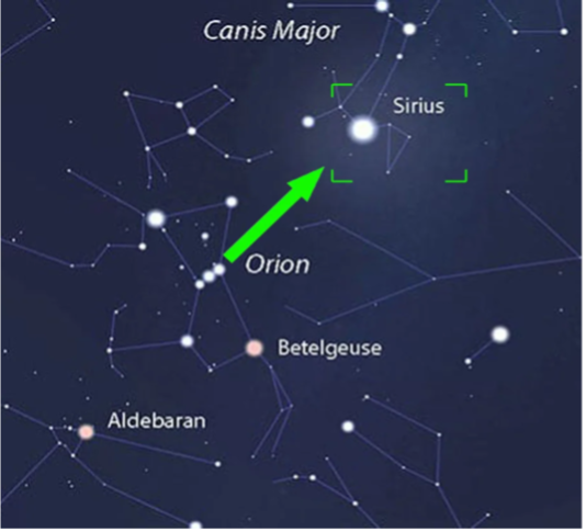 Follow the line of the Orion's Belt up and to the right towards the brightest star in the night sky, this is Sirius. Also sometimes called the DogStar, Sirius forms part of the constellation of Canis Major, one of the hunting dogs that is Orion's faithful companion.